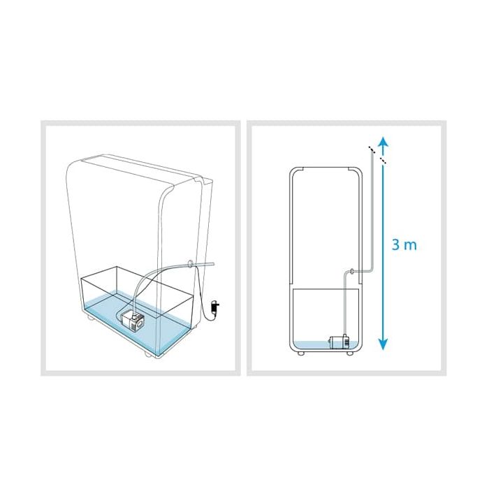 Genom att placera den här pumpen i uppsamlingstanken kan vattnet dräneras längre bort och uppåt via dräneringsslangen, vilket ger dig mycket mer frihet i var du placerar avfuktaren. Pumpen kan pumpa vatten uppåt till en höjd av cirka 3 meter. Eftersom pumpen sitter i uppsamlingstanken har du fortfarande avfuktarens säkerhetsfunktion, som stoppar om tanken blir full, till exempel om ångtillförseln till pumpen avbryts, slangen komprimeras, vikts eller blockeras.